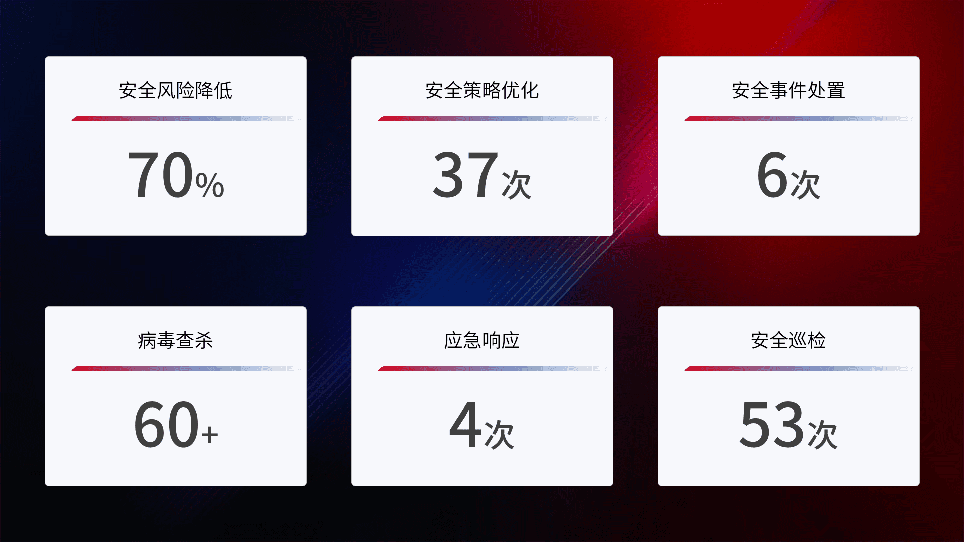 提供全面的安全事件报告体系,,,包括处置报告、、周报、、、、季度和年度总结,,,结合持续监控,,帮助客户深入了解网络安全状况。。。